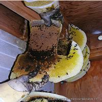 African honeybee colonies are always dangerous to handle, sometimes lethal, and can cause tremendous damage to homes and commercial building structures if not treated properly. Improper methods worsen the damage and lead to future bee problems. Bee pheromone, a marker scent the bee colony deposits at the site, does not go away on its own and cannot simply be scrubbed away with soap and water. A passing swarm can pick up the marker from a considerable distance away and will try to re-occupy a former bee site before it will go anywhere else. Honeycomb, if not removed properly, will immediately start attracting robbing bees from other local colonies and begin liquefying and melting down. Honeycomb meltdown can saturate building materials like drywall and insulation, cause wet rot to framing structures, attract other unwanted pests and spread pheromone scent throughout your walls making the problem much larger.